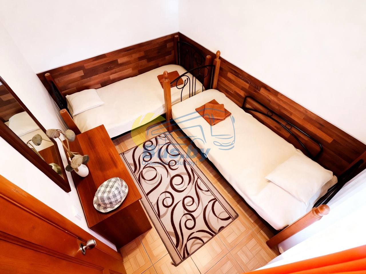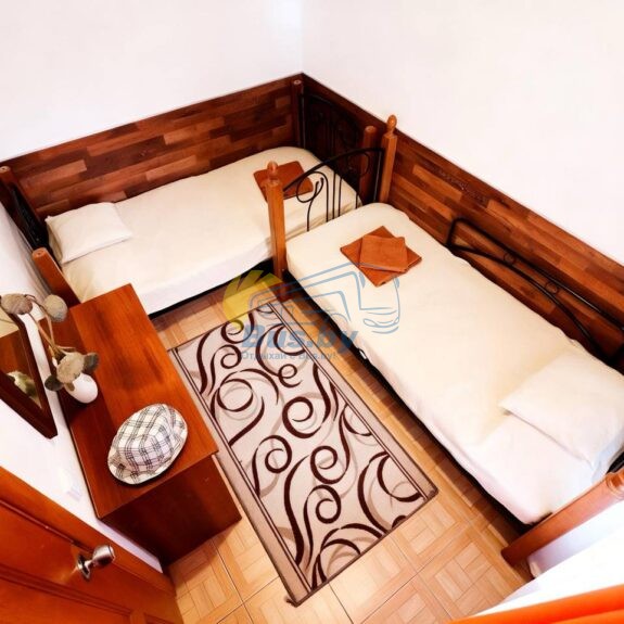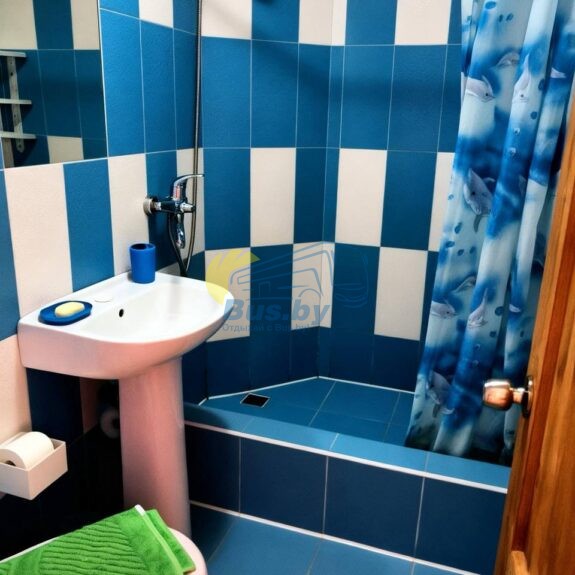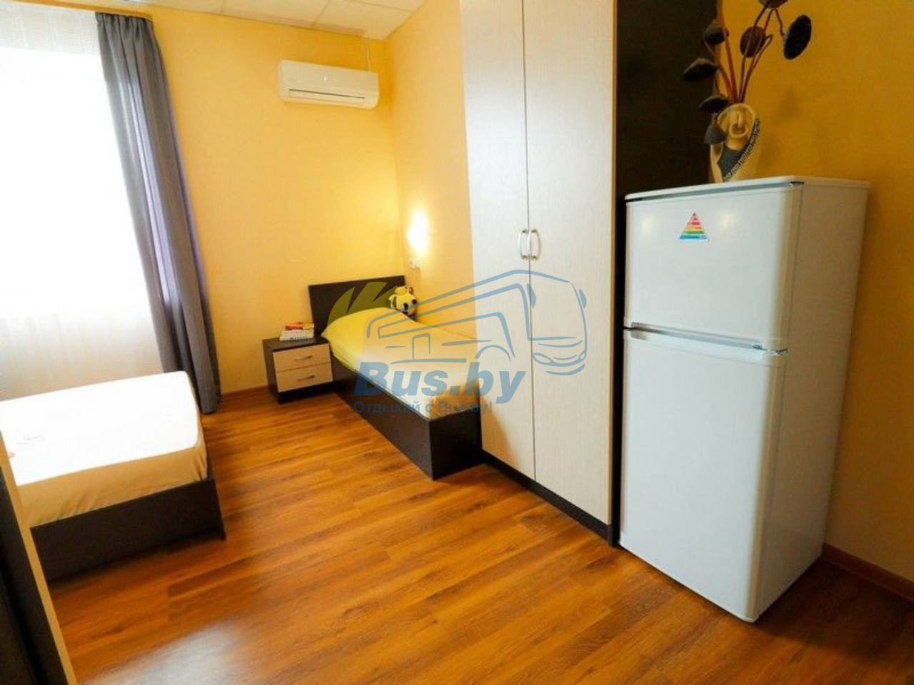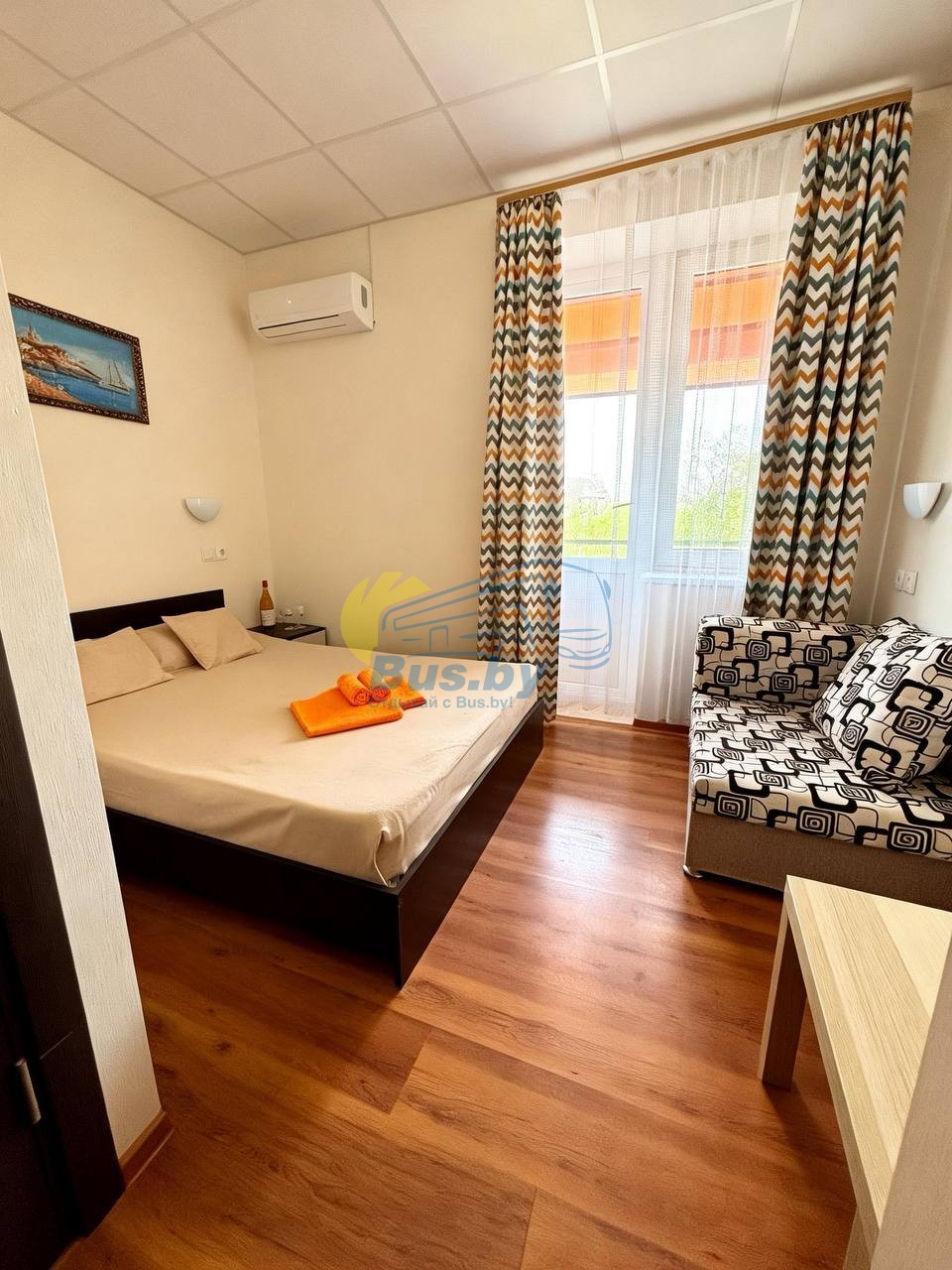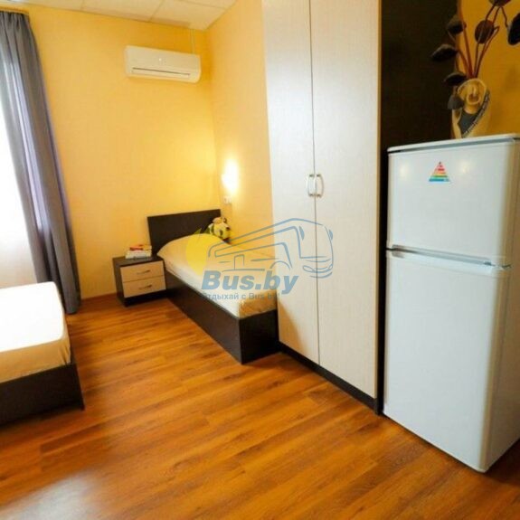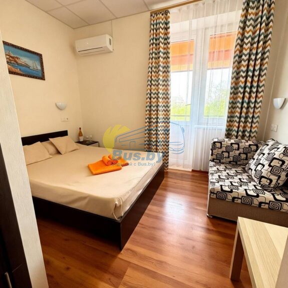 4-х местный двухкомнатный: двуспальная кровать в одной комнате и две односпальные во второй комнате, душ, туалет , сплит-система, холодильник и телевизор.